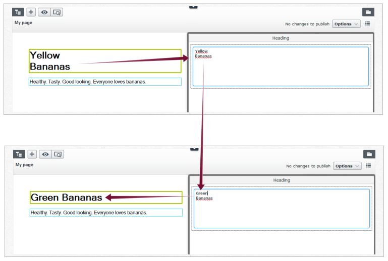 At first it may seem like we've solved the challenge. Both properties are editable in on-page-edit mode using text areas and a line break in the Heading property is replaced with a br tag. However, let's look at what happens when we make a change to the Heading property: