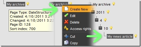 With these two classes added to our web project we can compile and begin using the new DateStructure page type. For instance we can create a new page of type DateStructure that we name “My archive”. If we then right click on our newly created “My archive” page and choose to create a page of some content type, such as the standard page page type from the public templates, and publish it we’ll see three new pages under “My archive” and that our content page has been put as a child of the last leaf in the tree.