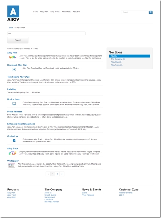 While the purpose of this post, and the code, is to show how to build a better search page for the Alloy templates most of the code and concepts are generic and can be reused on just about any EPiServer 7 site. The search page discussed in this post reuses CSS classes from Bootstrap and some from the Alloy templates and looks similar to the one that exists out-of-the-box in the Alloy templates. However, since it uses Find it offers better free text search and best bets. It also brings searching in VPP files, highlighting of keywords, a facet with filters for section on the site and paging. Using a number of properties on the search page’s page type it also allows editors to control some of it’s functionality. Below is an example of how it looks.