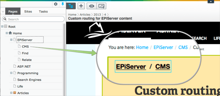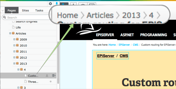 The first example is drawn from how articles are routed on this site. The article you're currently reading is tied to the EPiServer CMS category (a page) on the site which is reflected in navigation elements.