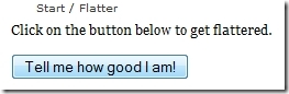 So far we have only communicated with the view by modifying it’s Model property. We do have one last thing to test however, which will demonstrate another way to communicate with the view. The requirements said that when a visitor presses the button to get flattered the button should be hidden. In less graphical terms this means that the view should stop accepting requests for flatter, which we’ll create a test for.