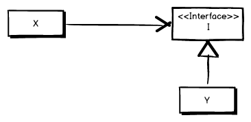 In the illustration above Y implements I and X uses an instance of I. While it’s quite possible that X still uses Y what’s interesting is that X doesn’t know that. It just knows that it uses something that implements I.