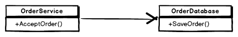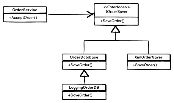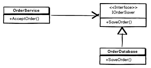OrderService no longer knows about the OrderDatabase class. It just uses an instance of the IOrderSaver interface of which OrderDatabase is one of possibly many implementation.