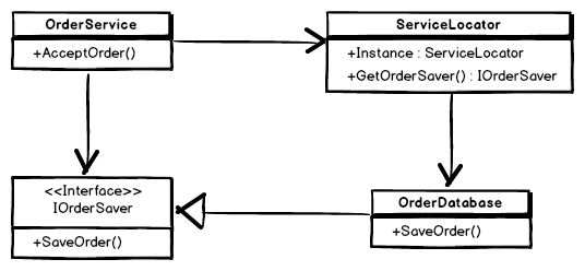 In the diagram above OrderService doesn’t know about OrderDatabase but it does know about an instance of the concrete class ServiceLocator which in turn knows about OrderDatabase.