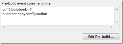 Finally we as we want to execute the copyconfiguration target each time the project is built we add a couple of lines to web projects pre-buid event to have it executed.