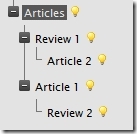 The RecursiveChildren strategy is a bit more advanced. It’s constructor requires a parameter with which we specify how many levels below the root page that we want to list. For instance, let’s assume that we have the page structure displayed in the image to the right. The pages below the Articles page are either of type Article or Review. The latter is a subtype of Article. If we view the page named Articles (whose template hosts the control) and configure the control with the code below the we will see four pages, Review 1, Article 2, Article 1 and Review 2.