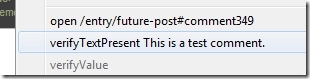 In Firefox I clicked on the link to the latest blog post, scrolled down to the comment form and posted a new comment. Then I right clicked on the text in the newly posted comment and choose the verify TextPresent alternative.
